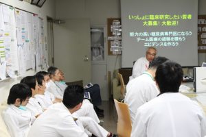 今回は、研修医の先生による症例発表と糖尿病代謝内科の先生によるレクチャーでした。研修2年目の先生による症例発表は、堂々とした素晴らしい発表でした。初期研修修了まで残りあと数ヶ月!!ラストスパートです。糖尿病代謝内科の先生によるレクチャーは、症例を提示しながら分かりやすくお話いただきました。2型糖尿病の治療法としては食事療法、運動療法、薬物療法がありますが、食事療法の重要性が圧倒的であるとのこと。普段の食生活で参考になる身近な情報から、糖尿病性腎症等の合併症へのアプローチ方法等幅広くご教示いただき、有意義な勉強会となりました。
