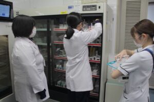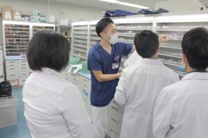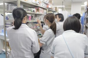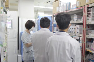 薬剤師と看護師のお仕事を見学してもらったり、業務を体験してもらったりしました。生徒さんたちは普段目にすることのない病院のバックヤードや医療設備に興味津々のご様子でした。