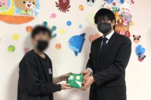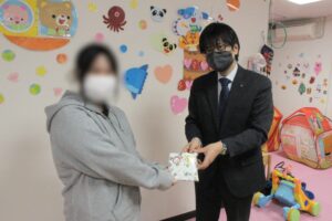 今年も病棟のプレイルームにて子どもたちにプレゼントをお渡しいただき、子供たちは笑顔を浮かべて受け取っていました。